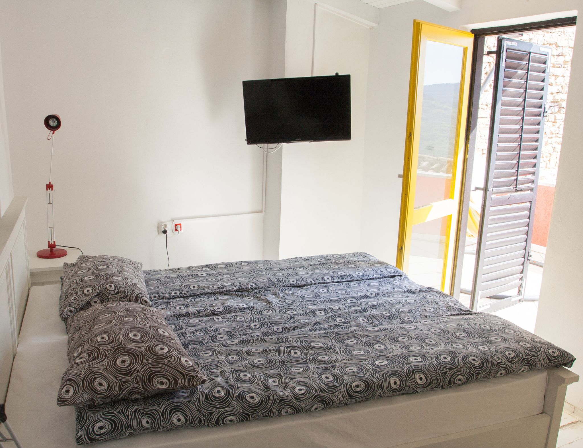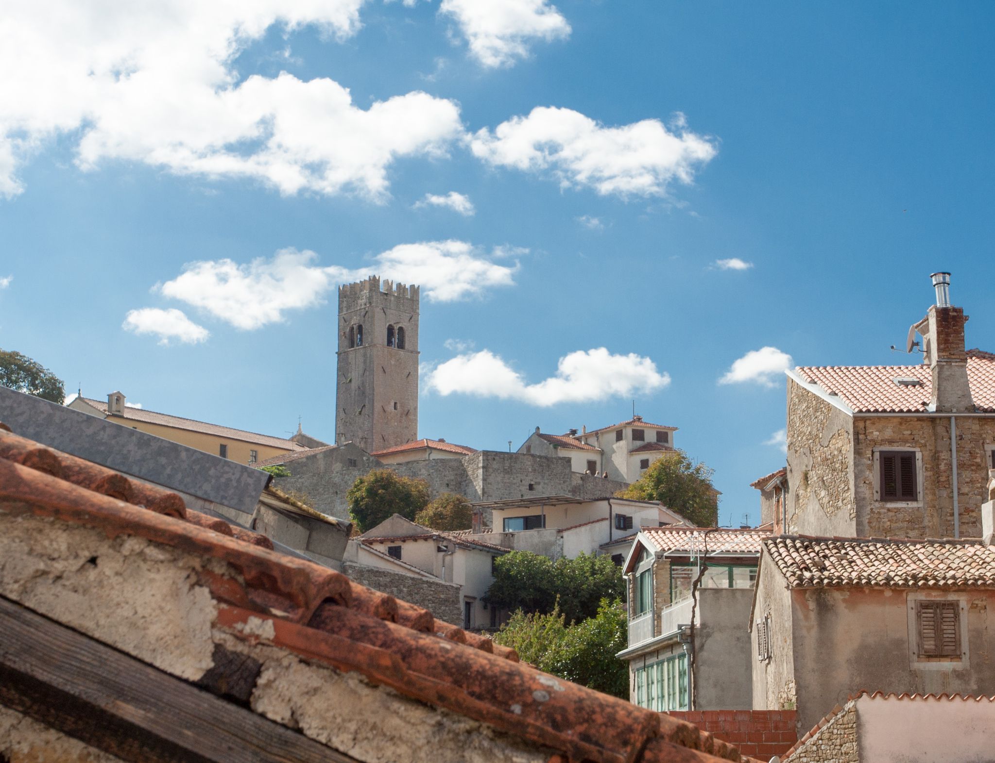 Dvokrevetna soba s bračnim krevetom i balkonom s kojeg puca pogled na južnu padinu, te na krovove i vrh Motovuna kojim dominira zvonik.